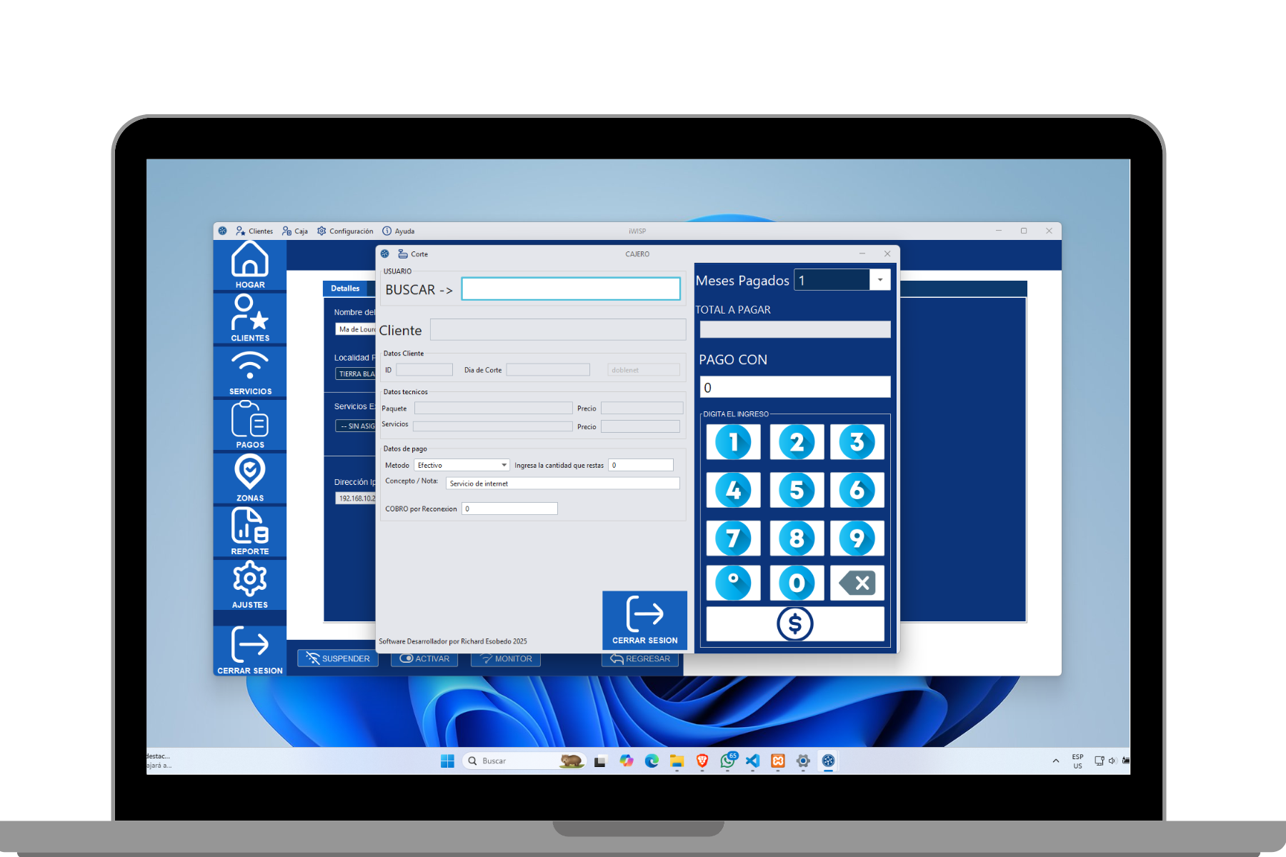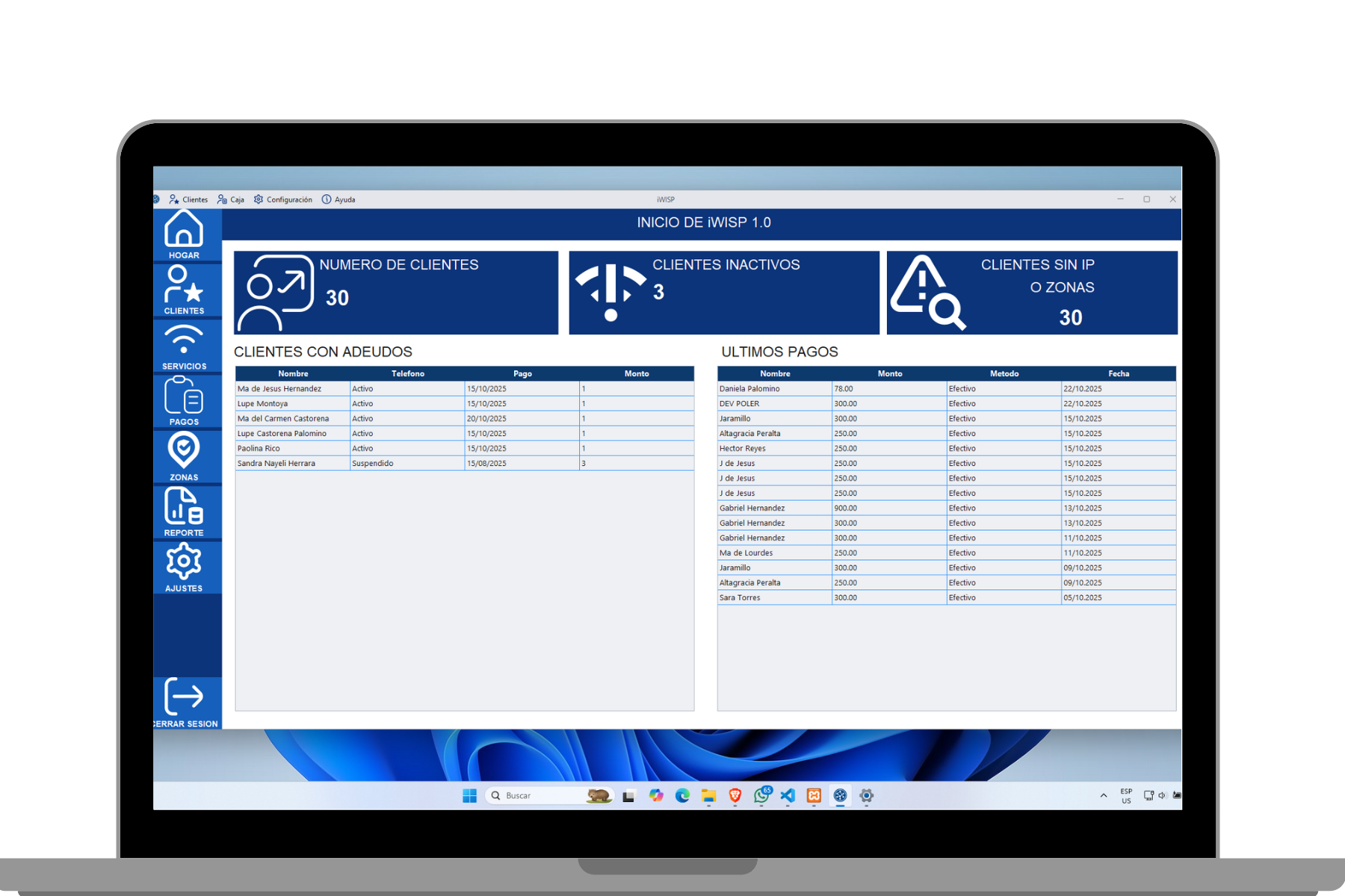 Clientes, pagos, reportes, monitoreo MikroTik y más, en una interfaz moderna inspirada en elementaryOS.